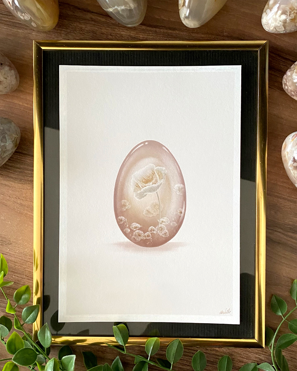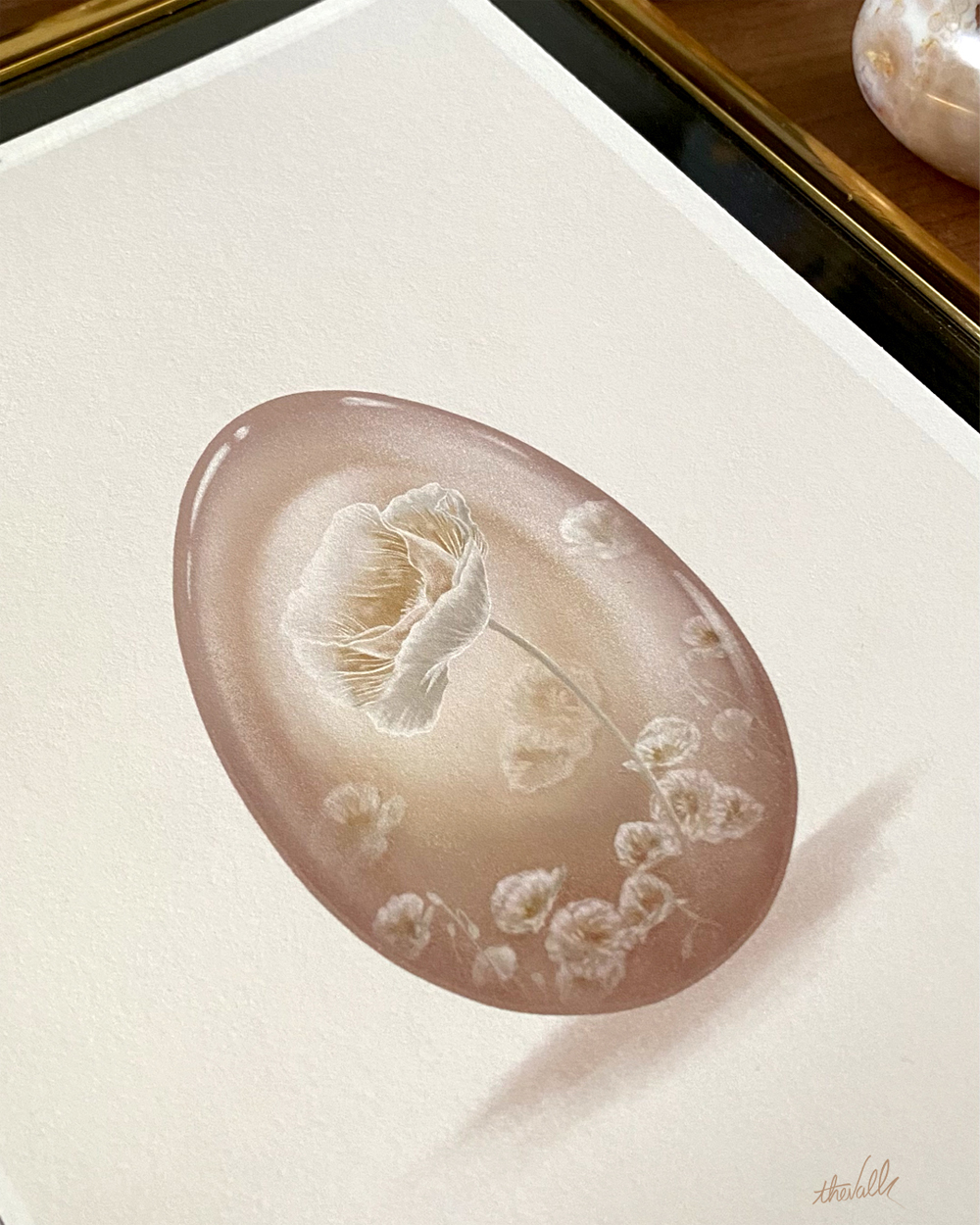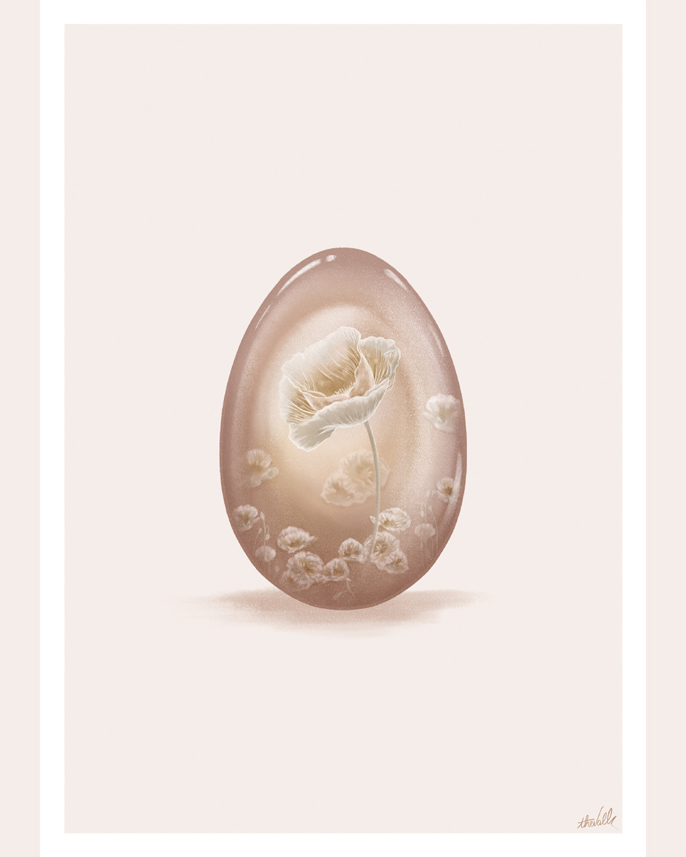 J’ai une collection d’œufs en agate sakura et en les admirant j’ai vu ces jolies fleurs écloses. Bien sûr je n’ai pas choisi d’illustrer une fleur de cerisier mais… un coquelicot. Mon petit coté humoristique peut-être (le coquelicot blanc existe, sisi !)