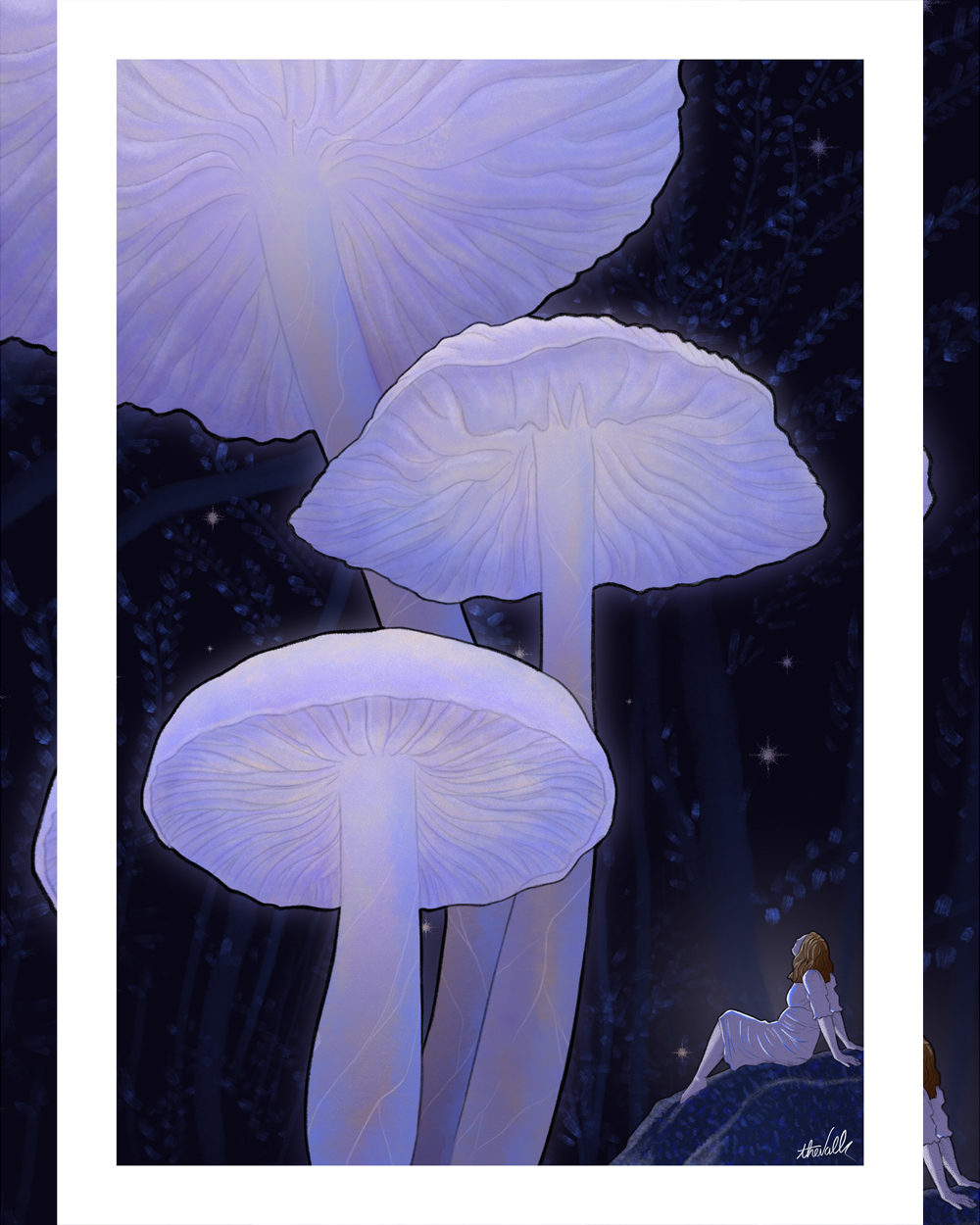 Il fait bon, le vent souffle un air chaud dans la nuit étoilée. Installez-vous confortablement et laissez-vous aller à la contemplation de ces champignons bioluminescents. Une couleur affirmée rappelant celle de l’Agate violette.